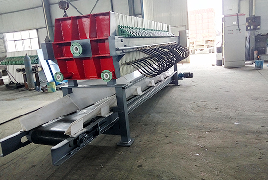 結構特點: 在壓濾機濾板下方裝置了皮帶輸送,用于輸送濾板拉開時卸下的濾餅。該裝置適用于不易做基礎的工作現場,可以把物料輸送到指定的地方,減輕了員工勞動強度,工作環境得到改善。本發明還在傳統輸送帶的基礎上做了改進,使壓濾液會因重力作用全部自動流到接水裝置中,出泥端不會有壓濾液流出而使壓干的污泥再次潮濕,壓濾液也不會流到地面上。
