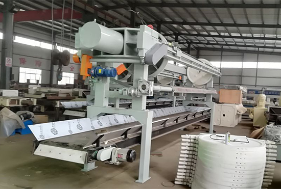 過濾、輸送壓濾機是在壓濾機濾板下方裝置了皮帶輸送,用于輸送濾板拉開時卸下的濾餅。該裝置適用于不易做基礎(chǔ)的工作現(xiàn)場,可以把物料輸送到指定的地方,減輕了員工勞動強度。